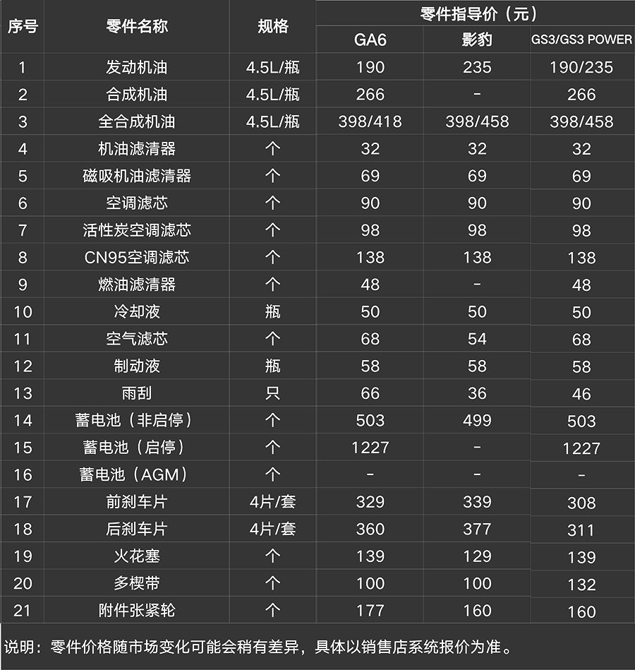 1、詳細(xì)的純正零部件價(jià)格可咨詢當(dāng)?shù)劁N售服務(wù)店,或致電廣汽傳祺服務(wù)熱線:400-813-6666(只需付市話通訊費(fèi))